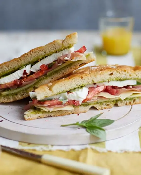 Focaccia with prosciutto, Leerdammer, mozzarella and pesto